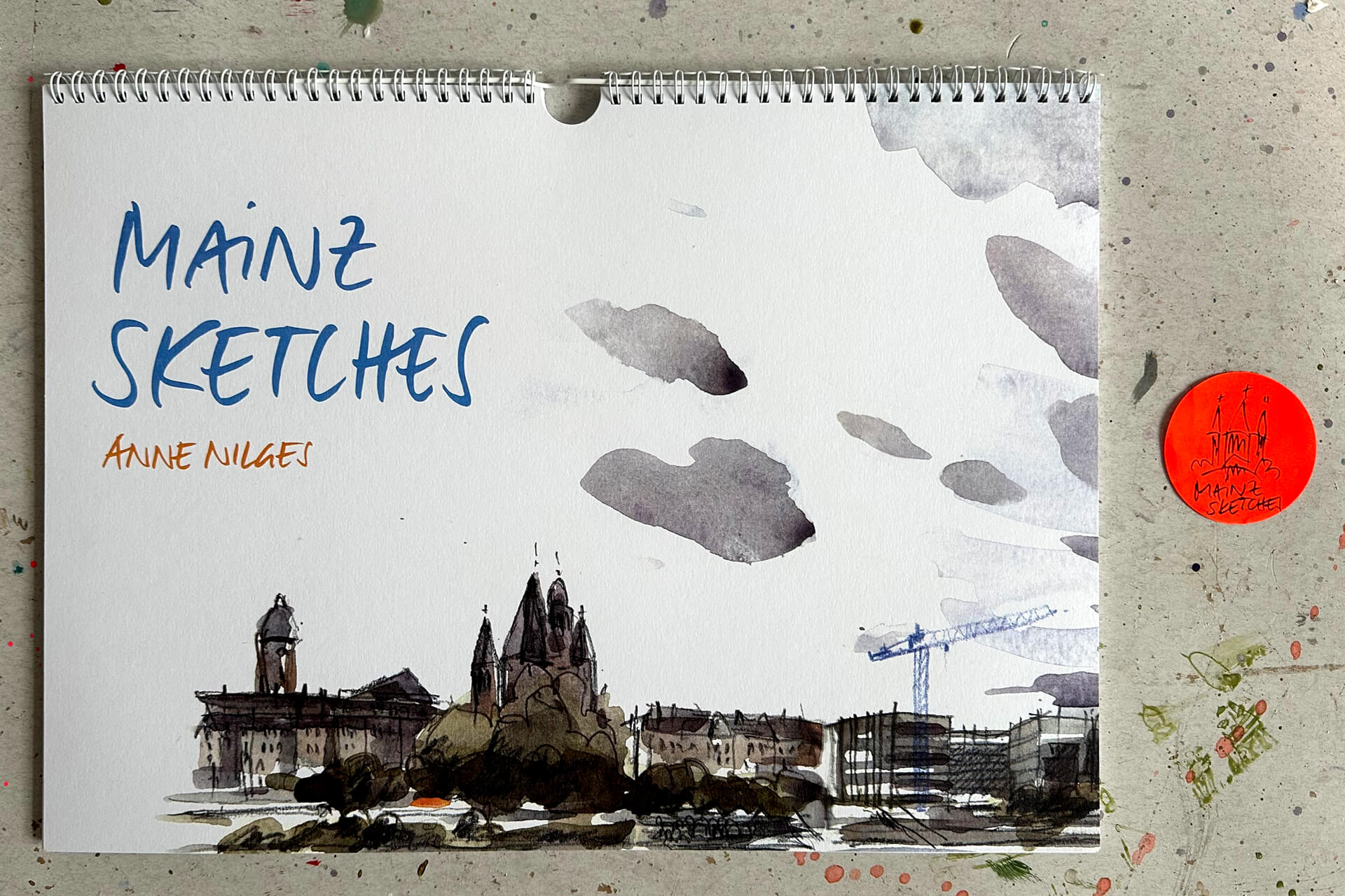 Caroline und ich haben zwölf Motive ausgewählt, die eine andere Seite von Mainz zeigen – meine persönliche Sicht auf die Stadt. Es sind Zeichnungen vor Ort, reduziert gehalten, Aquarell mit Farbstift, direkt im Skizzenbuch entstanden. Manche Blätter tragen noch die Spur der Heftbindung. Es sind „normale“ Orte, Alltagsansichten, und gerade deshalb konzentriert sich der Blick auf das Wesentliche.