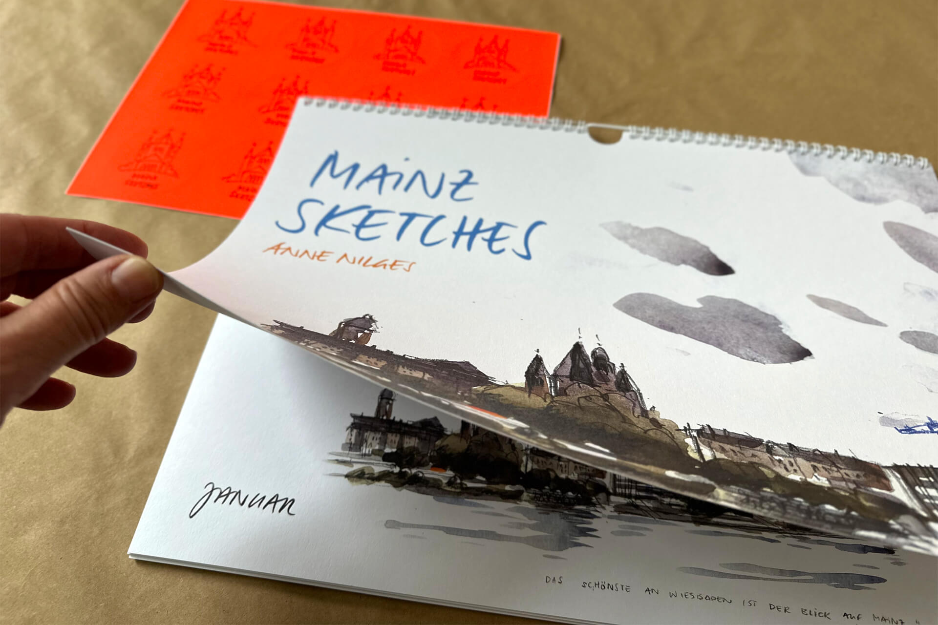 Der Kalender hat bewusst kein Kalendarium, die Blätter tragen nur den Monatsnamen. So lässt er sich über mehrere Jahre hinweg nutzen – als Begleiter an der Wand, der nicht abläuft. Er ist auf 300 g starkem Papier im Format A3 gedruckt und eher ein Sammlerstück als ein Gebrauchsgegenstand. Den Auftakt bildet eine Stadtansicht von Mainz, und am Ende gibt es eine Übersicht aller zwölf Motive – sowie eine kurze Vorstellung meiner Arbeit.