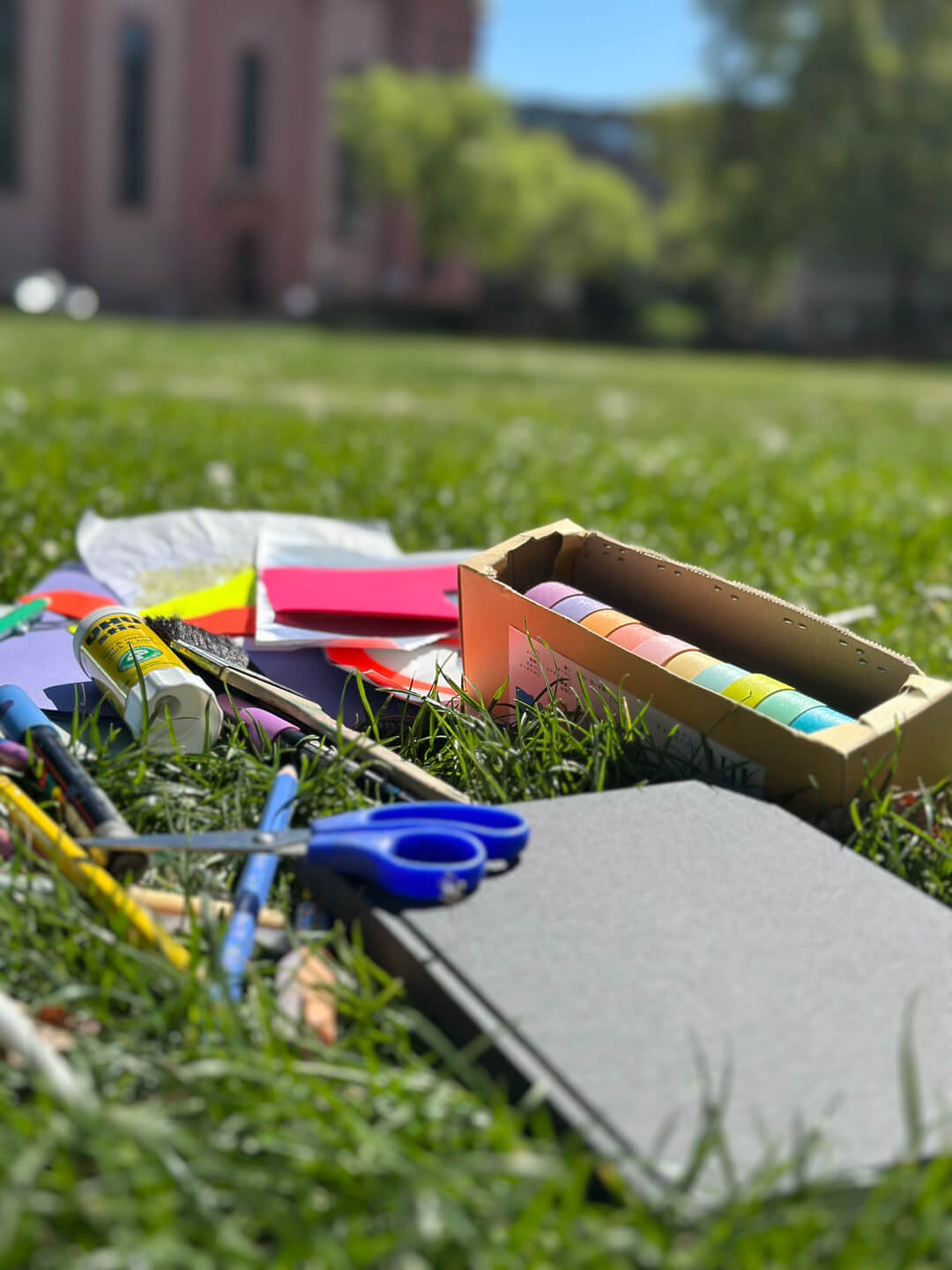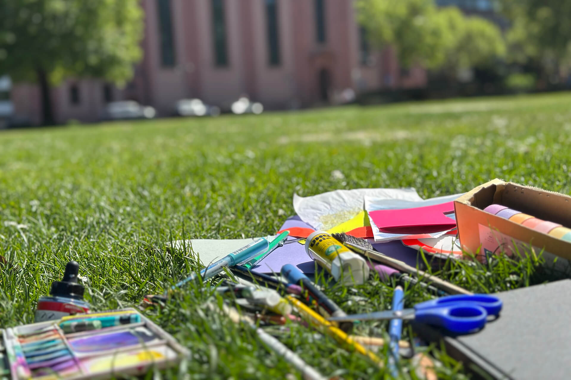 Skizzenbuch, Stifte und Aquarellfarben, Pinsel, Metallklammern sowie Material für experimentelleres Arbeiten: Washi-Tape, Schere, Klebestift, einige Papiere für Collage/Schablonen und – falls vorhanden – eine Gelplatte. Außerdem alles, was du zum Arbeiten draußen brauchst: Wasser, Tuch, Sitzgelegenheit und Wetterschutz.