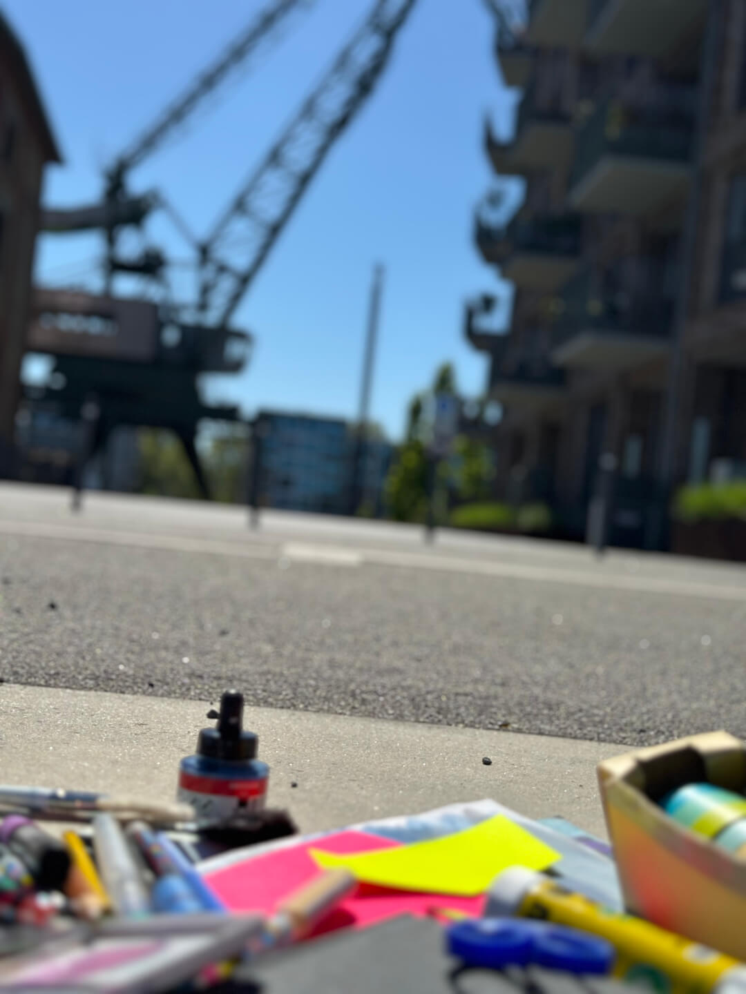 Hier wird Urban Sketching ein Stück gedehnt. Wir schauen über den Tellerrand und nehmen Techniken mit nach draußen, die man sonst eher aus dem Atelier kennt: Schablonen, Hintergründe, Washi-Tape, Collage, Überlagerungen, reduzierte Flächen — und z. B. auch mit der Gelplatte.